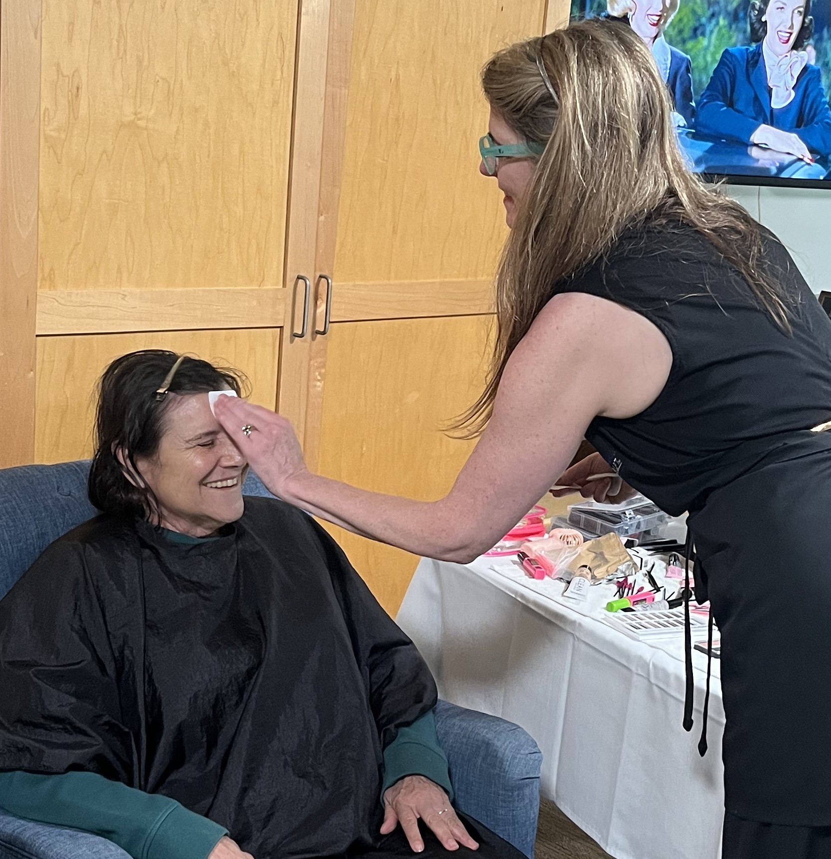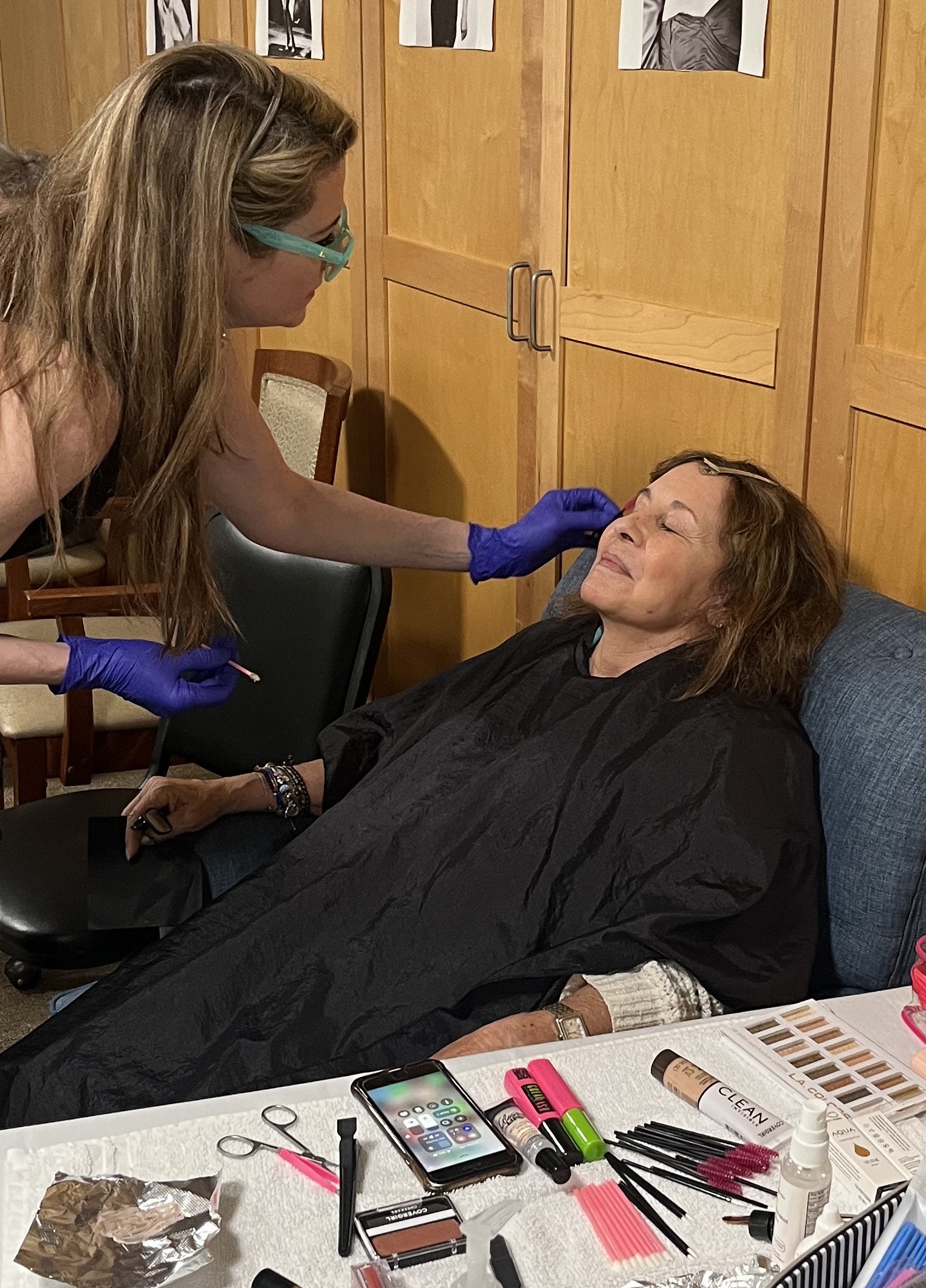 Amy Landers is a volunteer who offers makeup and eyebrow services. She is a licensed esthetician and owner of East Side Lash Studio in Asheville. These makeovers, lovingly referred to as “Try New Looks with Amy,” take place in the activity room at Heather Glen, where the staff sets the tone by showing Marilyn Monroe movies and decorating in old-Hollywood style.